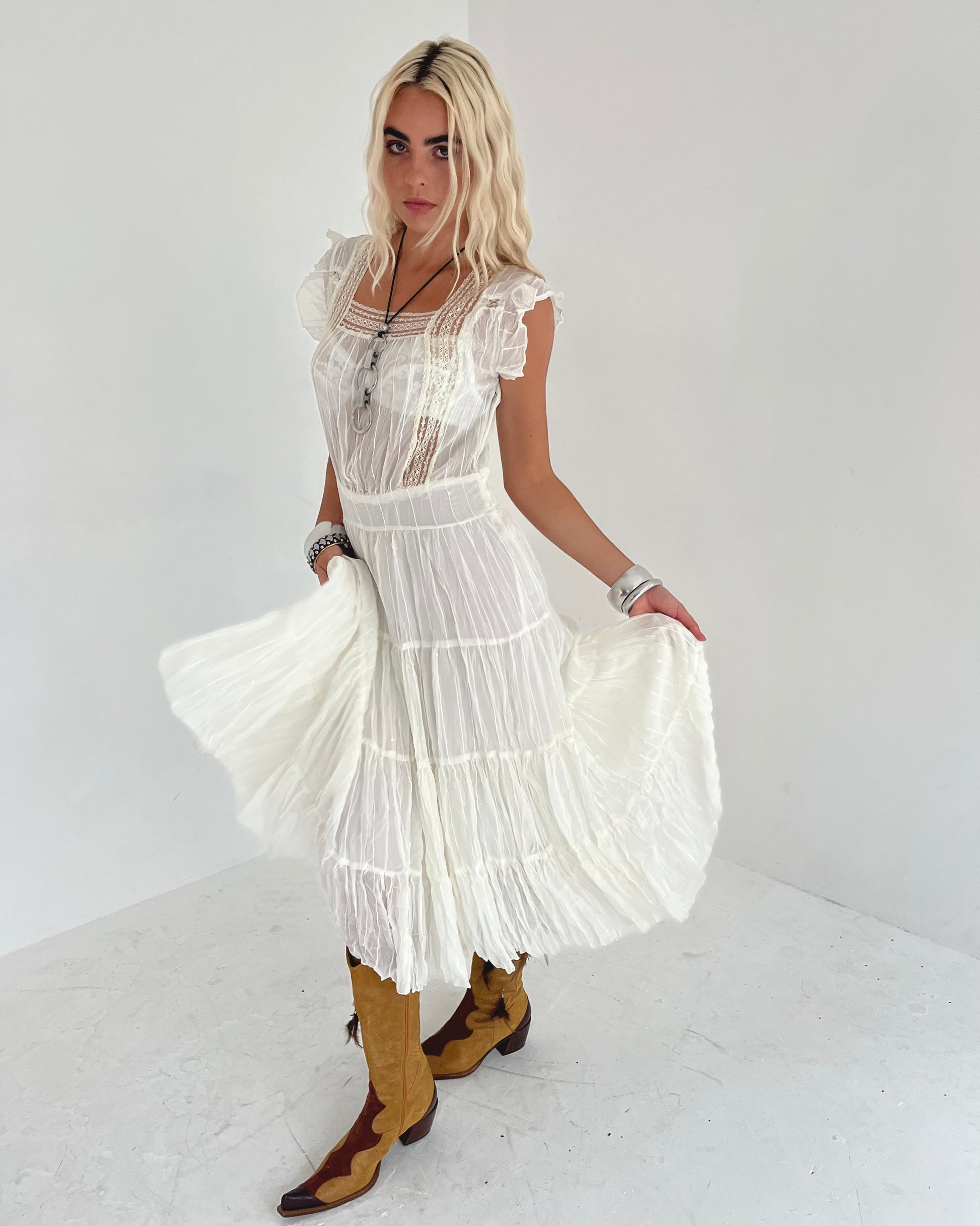 Vintage sheer boho dress with lace detail. Double lined on the bottom half. Zips at the side.
