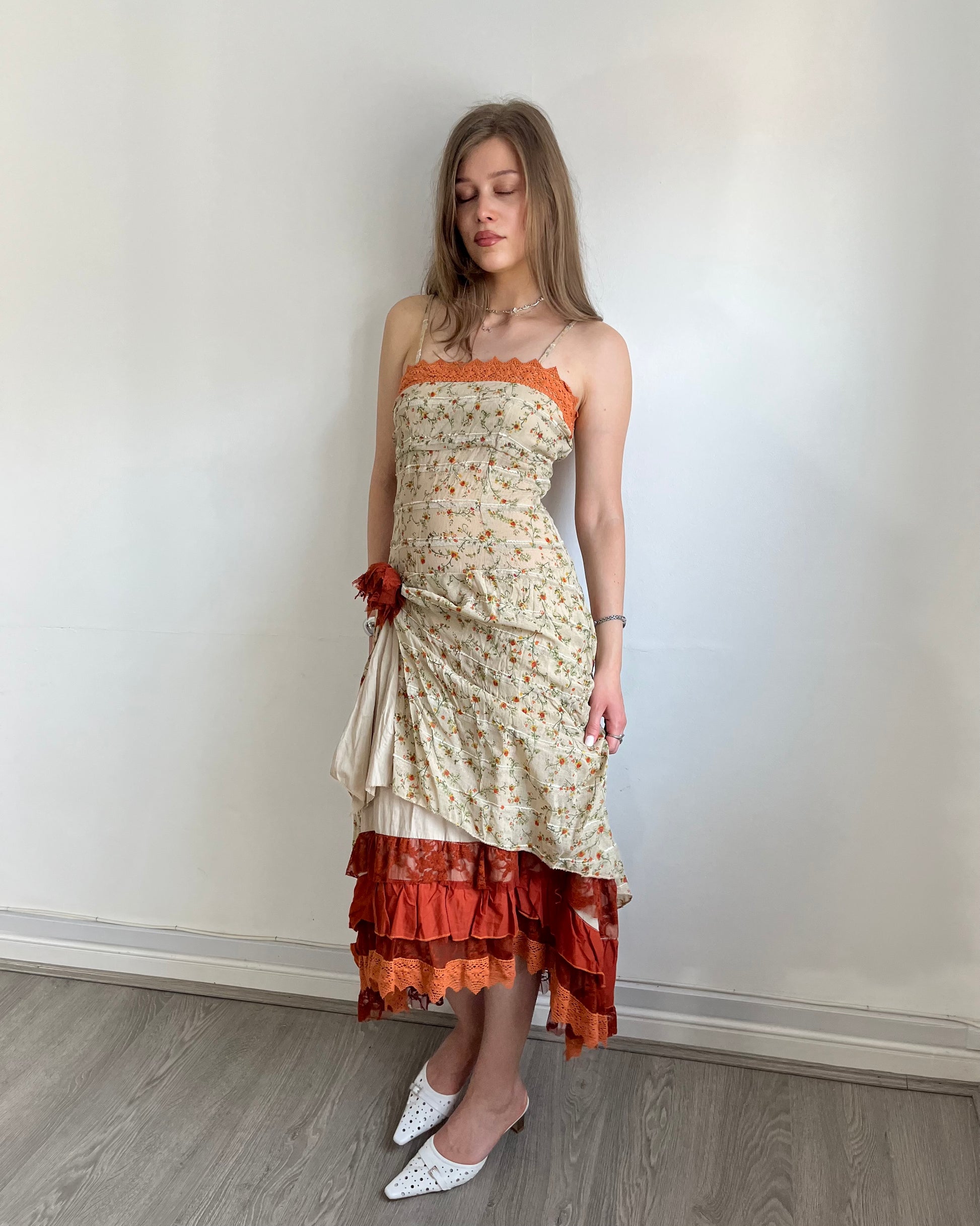 Vintage floral boho ruffle dress with lace trim and layered design.