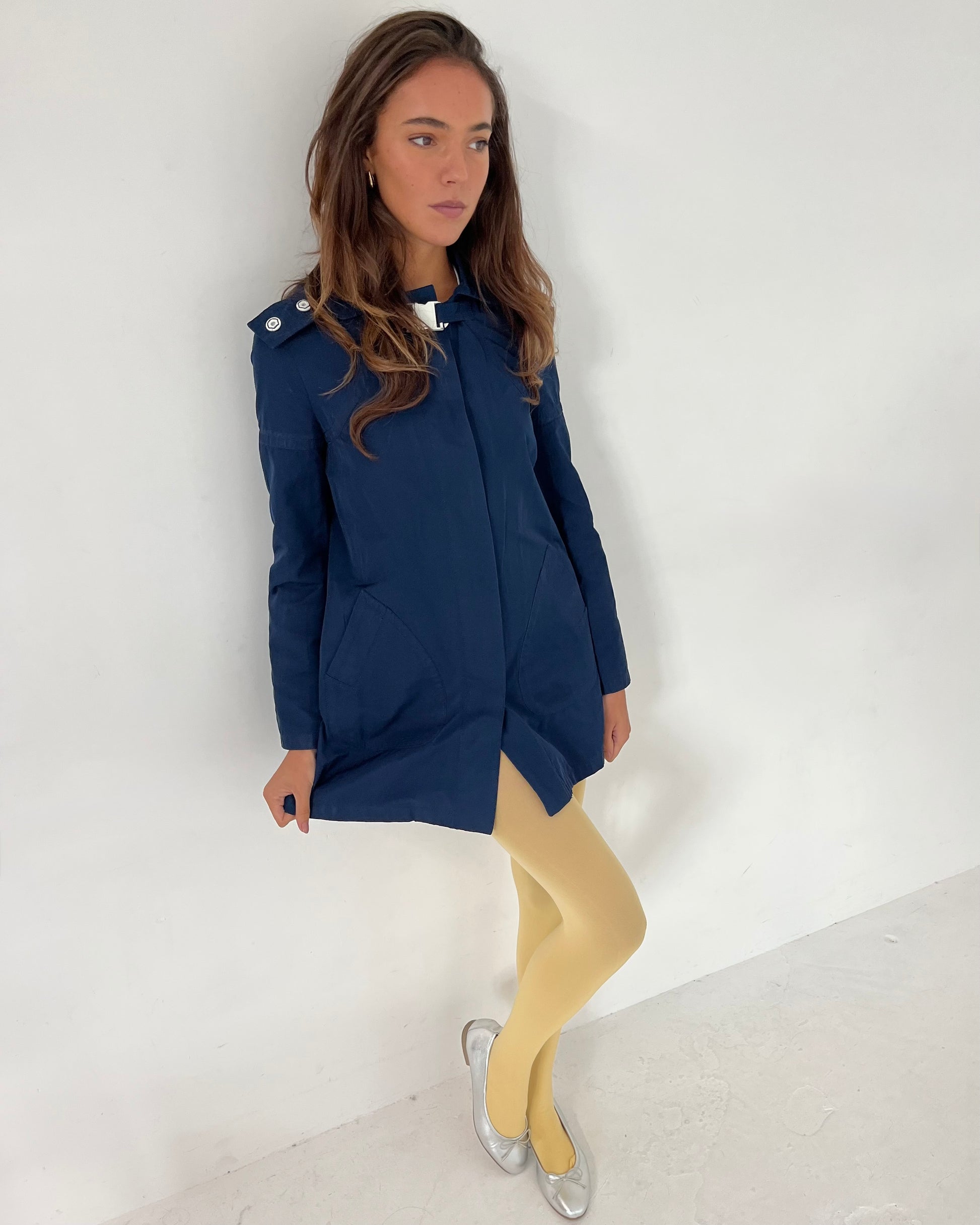 Vintage Dolce & Gabbana rain coat with hood and buckle closure. Hidden buttons.
