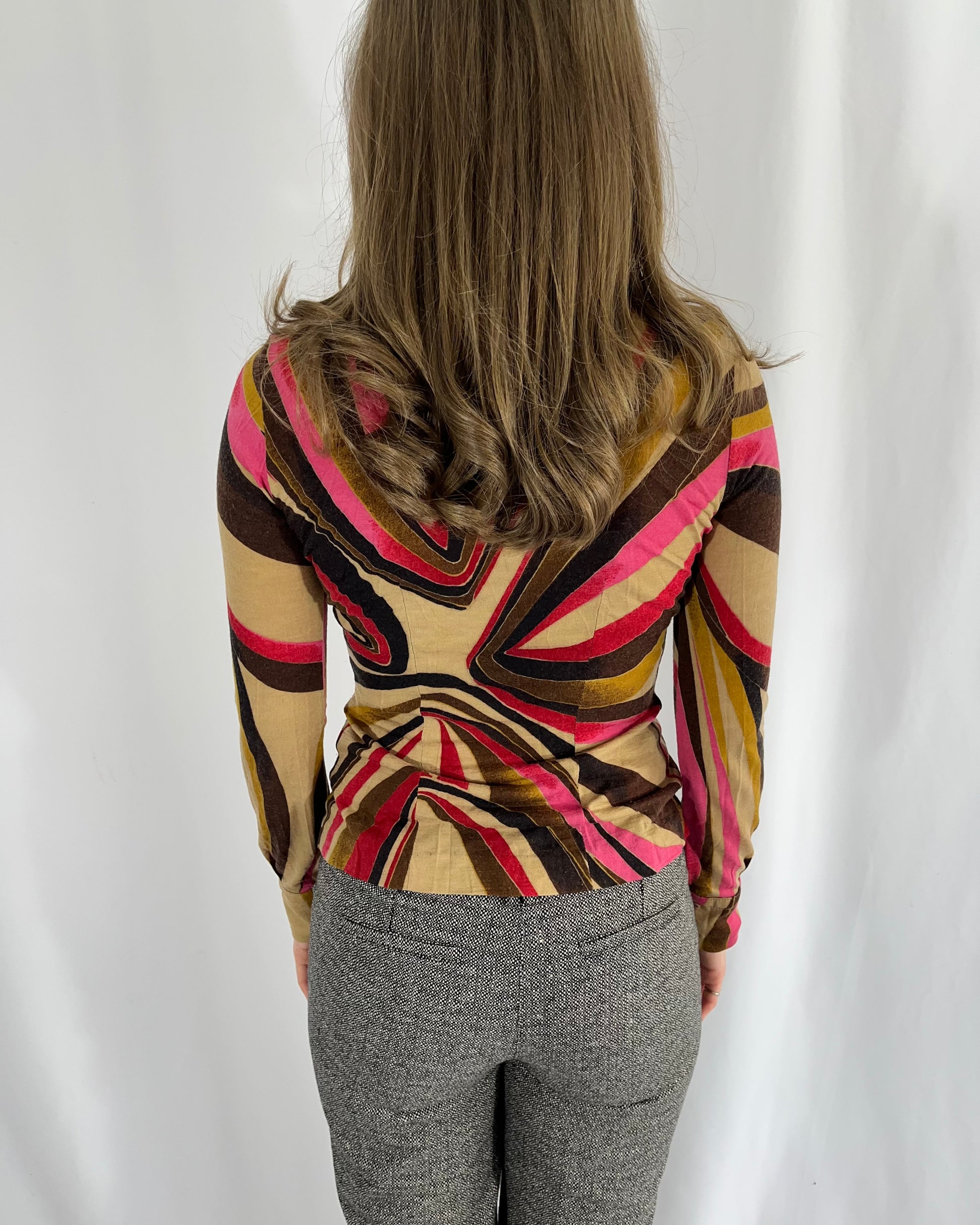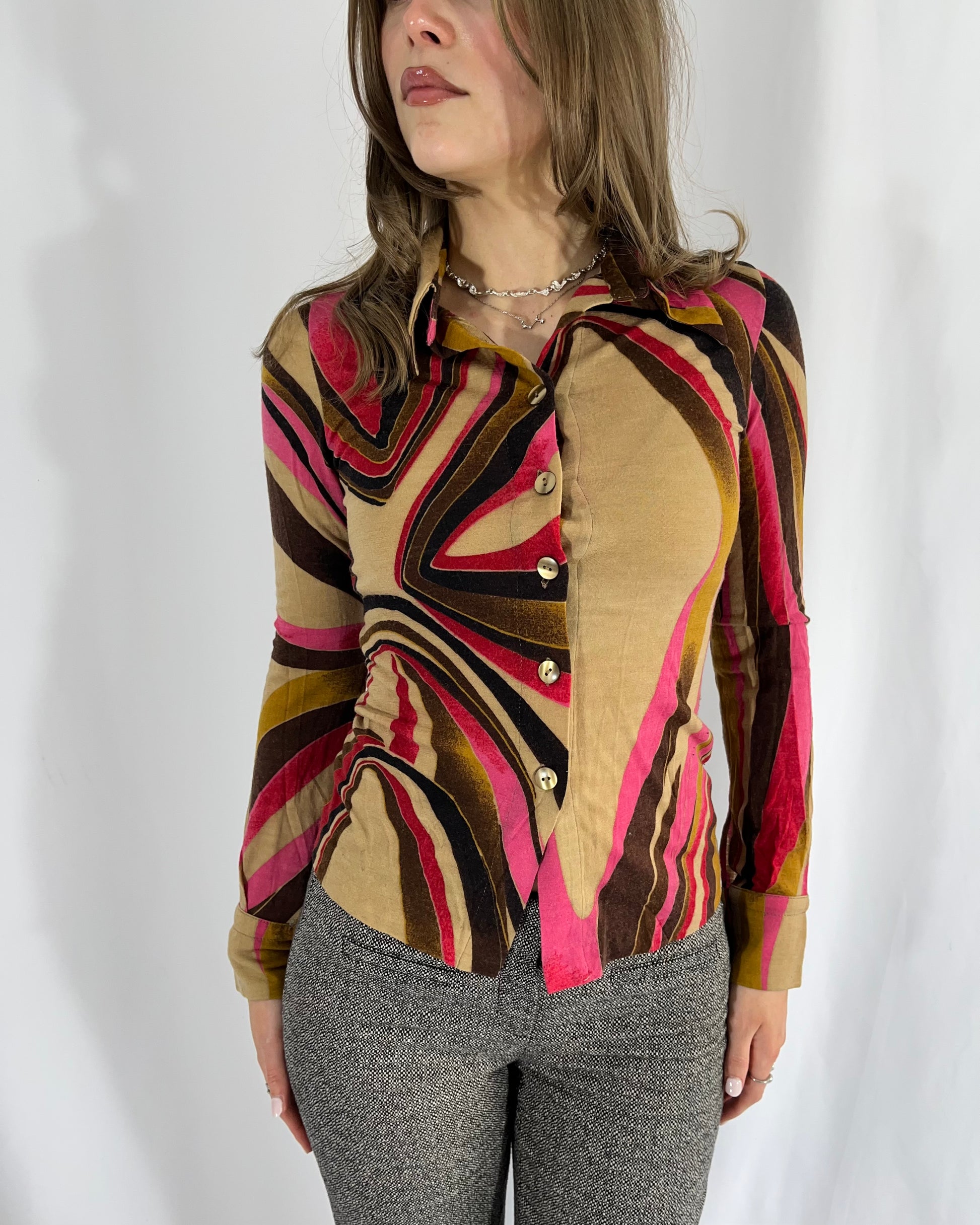 Vintage swirly print stretch button up shirt.