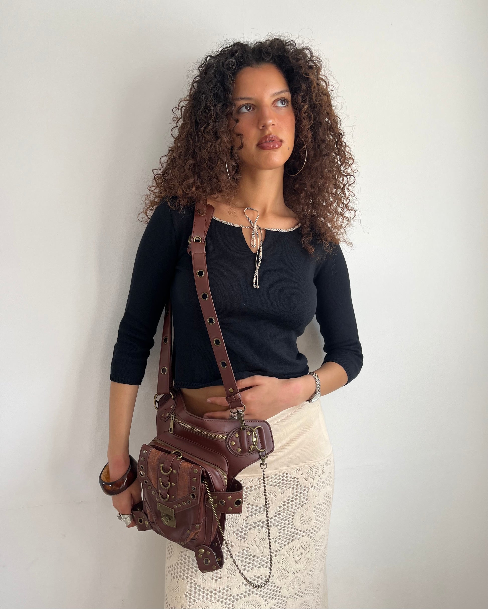 Vintage leather crossbody bag with metal hardware and stud detail. Comes with removable short strap.