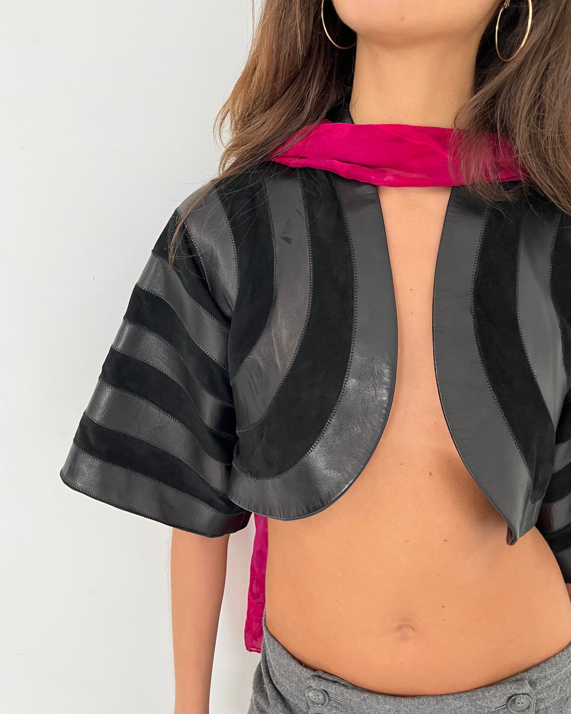 Vintage leather cropped jacket. Elastic to button loop closure.