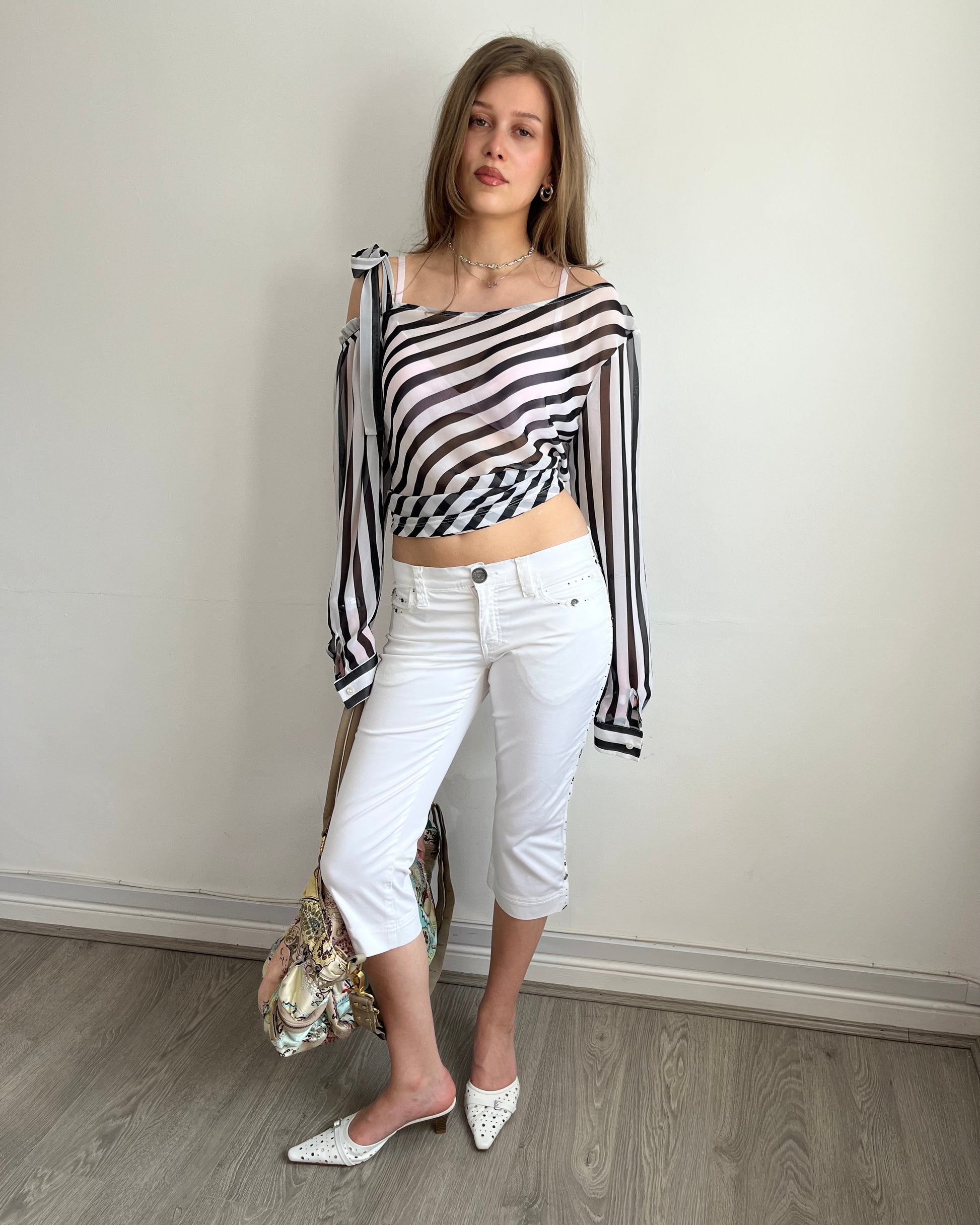 Vintage Moschino low waisted capri jeans with bead and button embroidered detail.