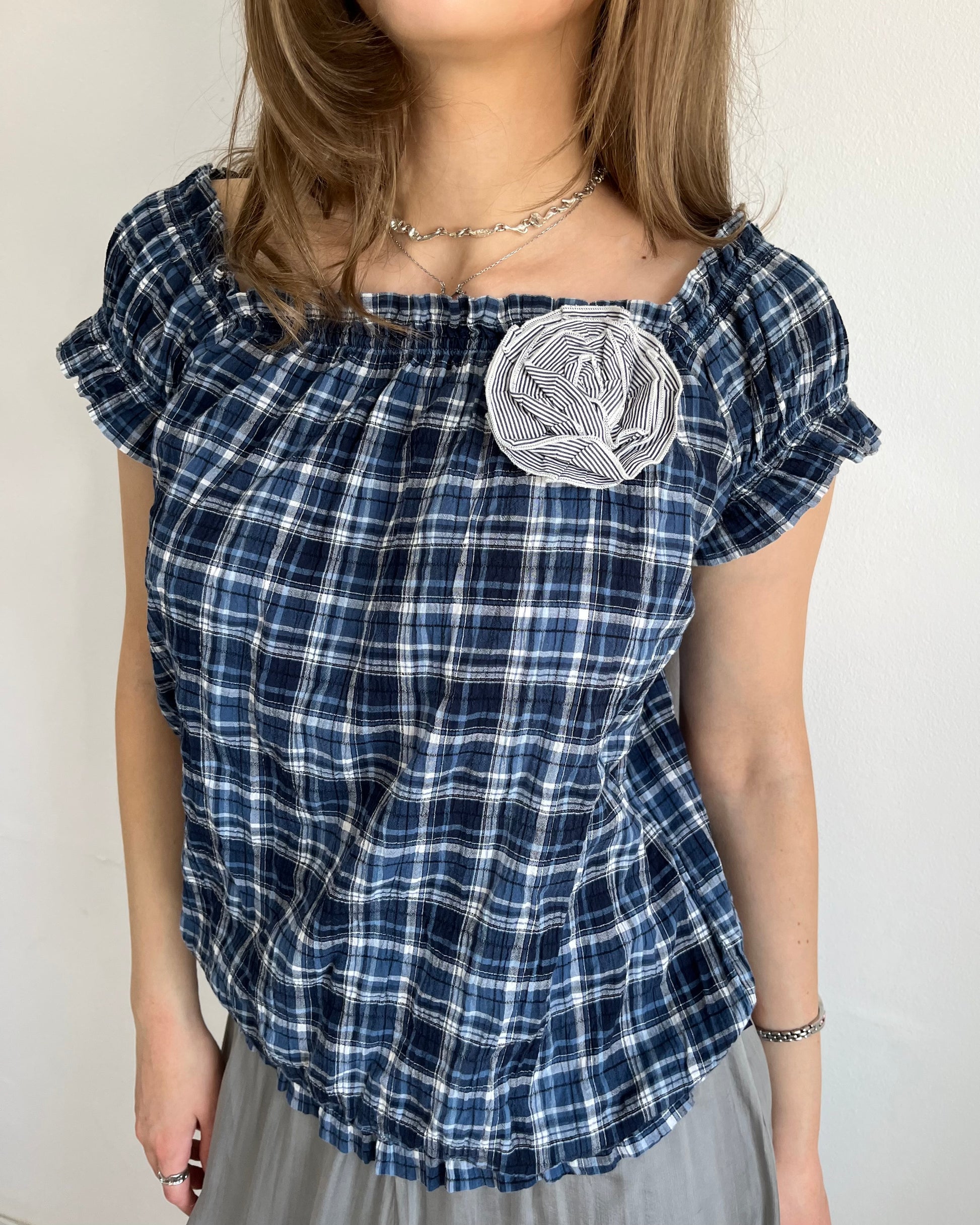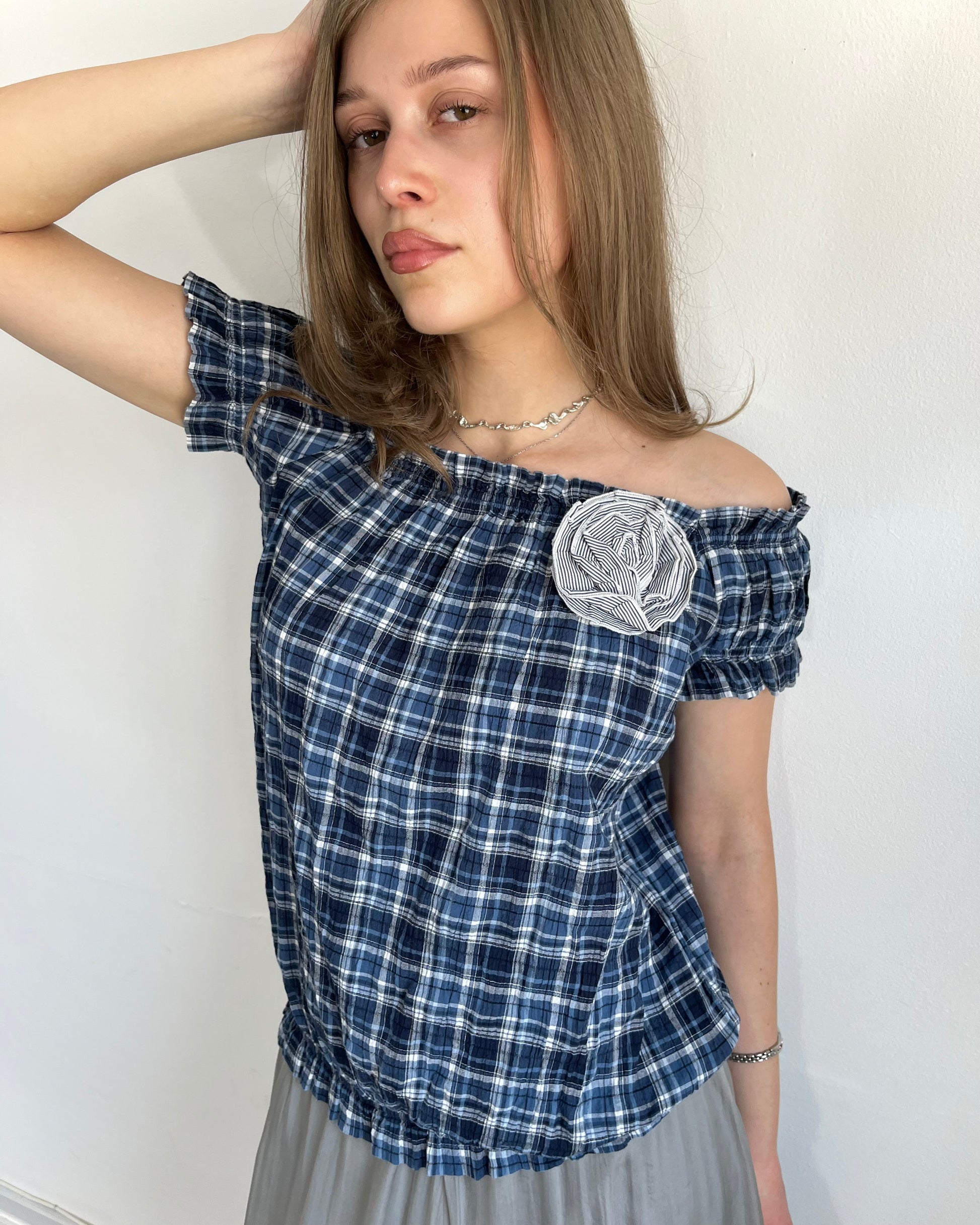 Vintage tartan off the shoulder top with a cinched waist and floral detail.