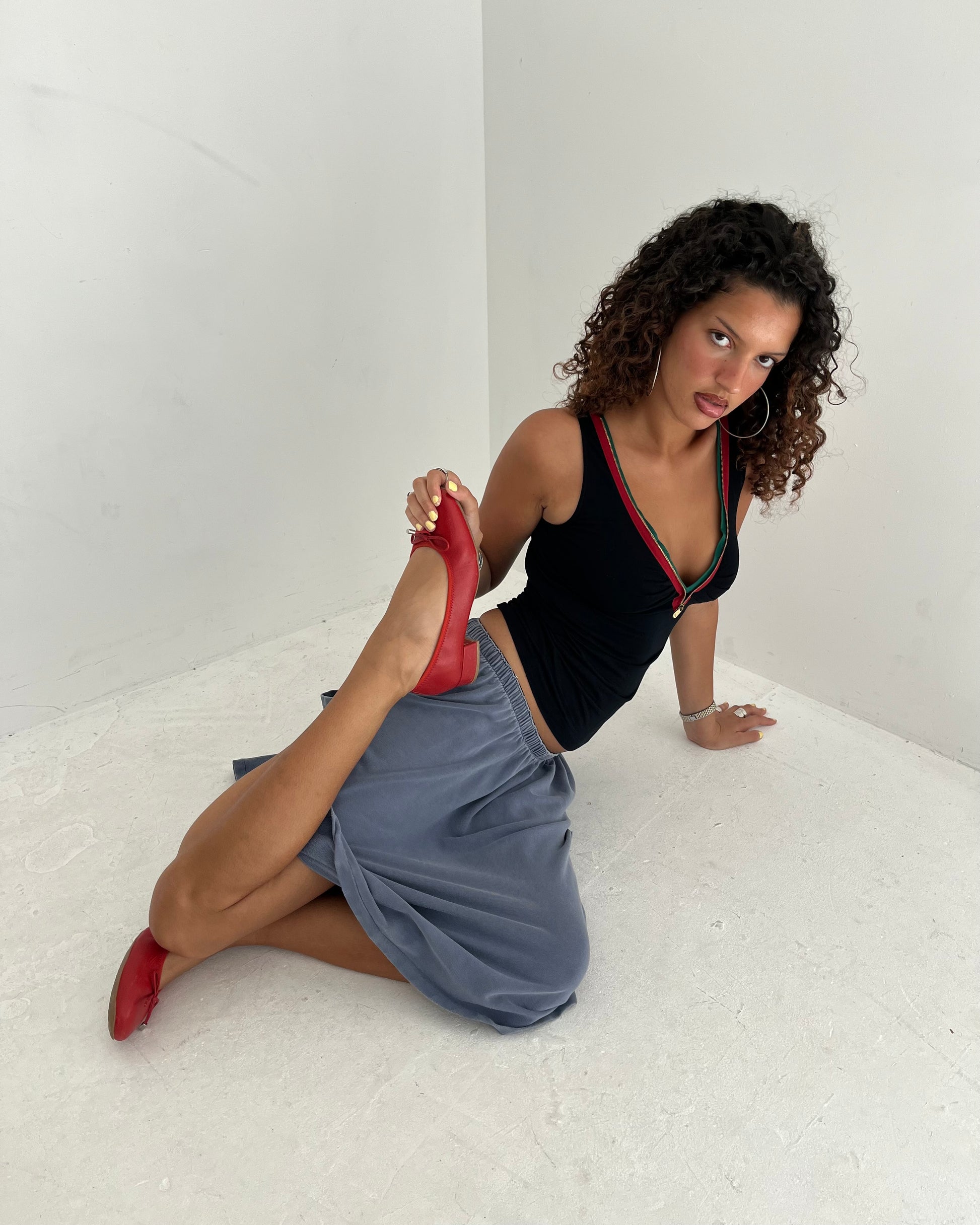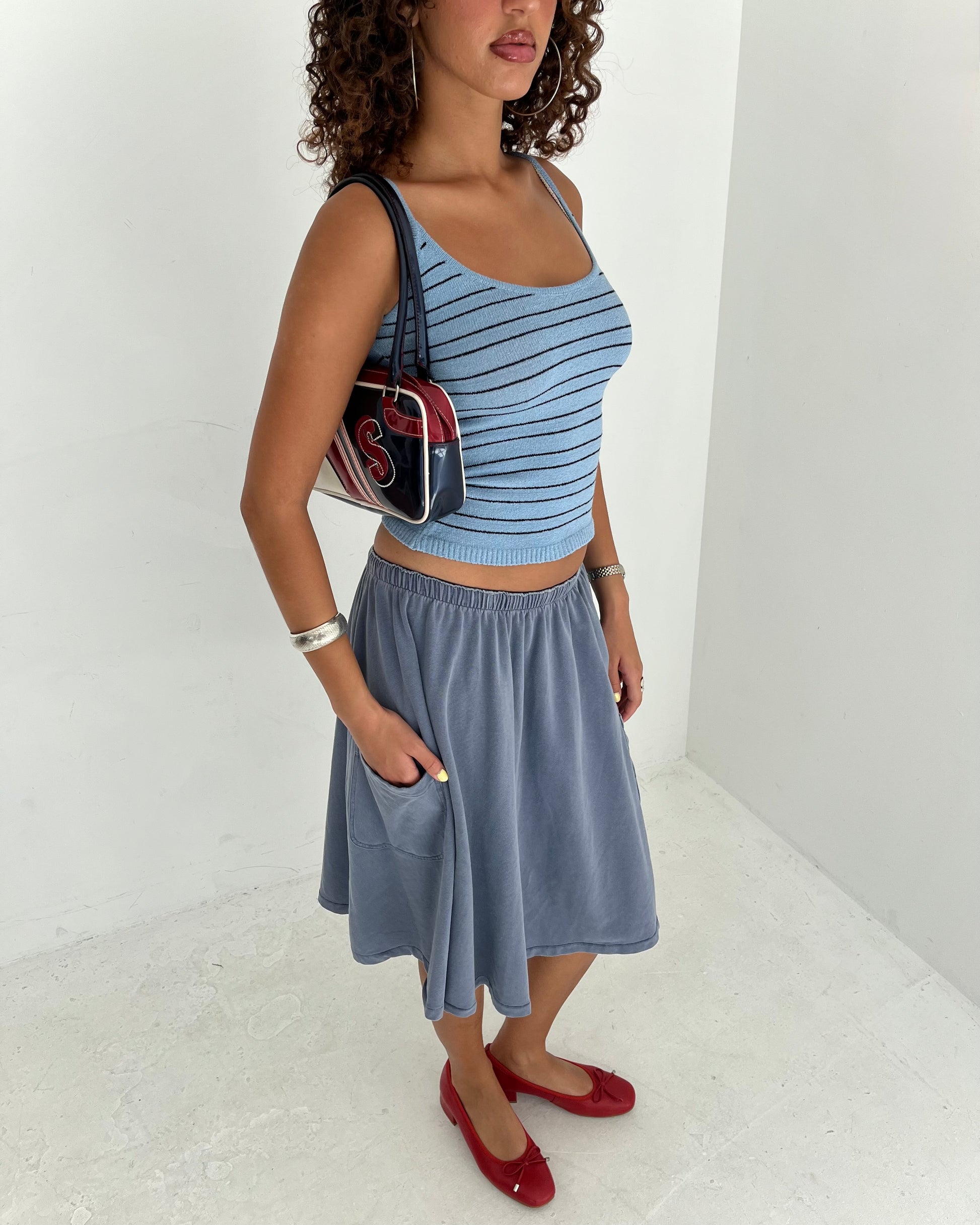Vintage Prada low waisted jersey knit midi skirt with pocket detail.